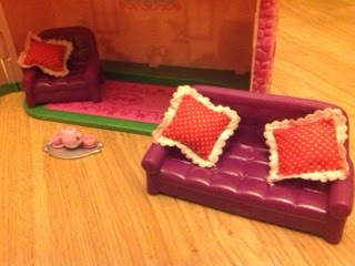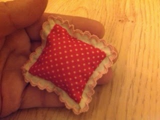 And finally, I made some pillows for the couches, with fabric scraps and little pieces of ribbon.