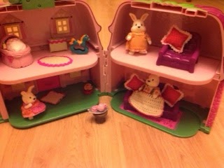 My daughter's problem? The house came with very few accessories and the rabbits can not live happily without a minimum of comfort. Truth be told, poor baby bunny had a bed with not even a blanket (and is dressed only in a diaper) and apart from that there were only two couches, a small table and a tea set. Definitely not up to my daughter's standards...
