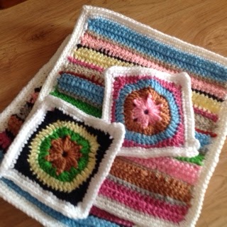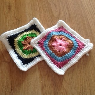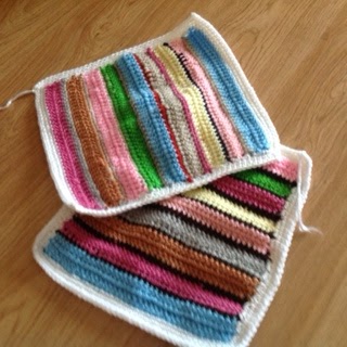 Although I used a 3.5 hook for the entire work, some of the yarns are thicker than others, and a few were used doubled. Which means that the squares turned out slightly wonky in places, but I'm sure that once assembled they will be OK.