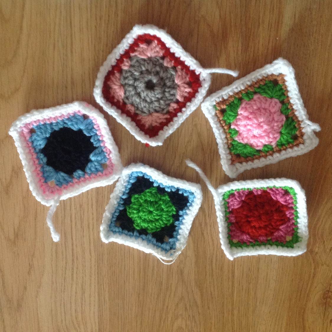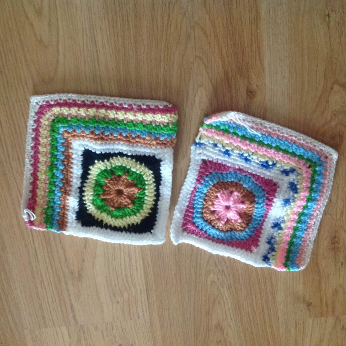Some of the squares look slightly wonky and this is due to the fact that I'm not using exactly the same type of yarn in each row (it's just yarn scraps, so I'm using what I have). Hopefully once assembled they will be