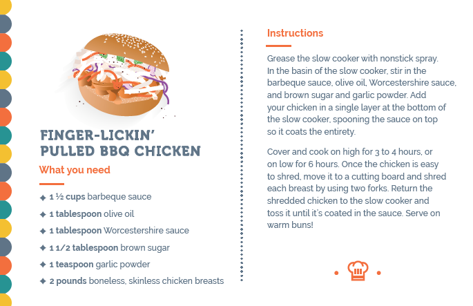 One of my favorites is the finger-lickin’ pulled bbq chicken since you can have it warm for dinner, or cold for lunch the next day.