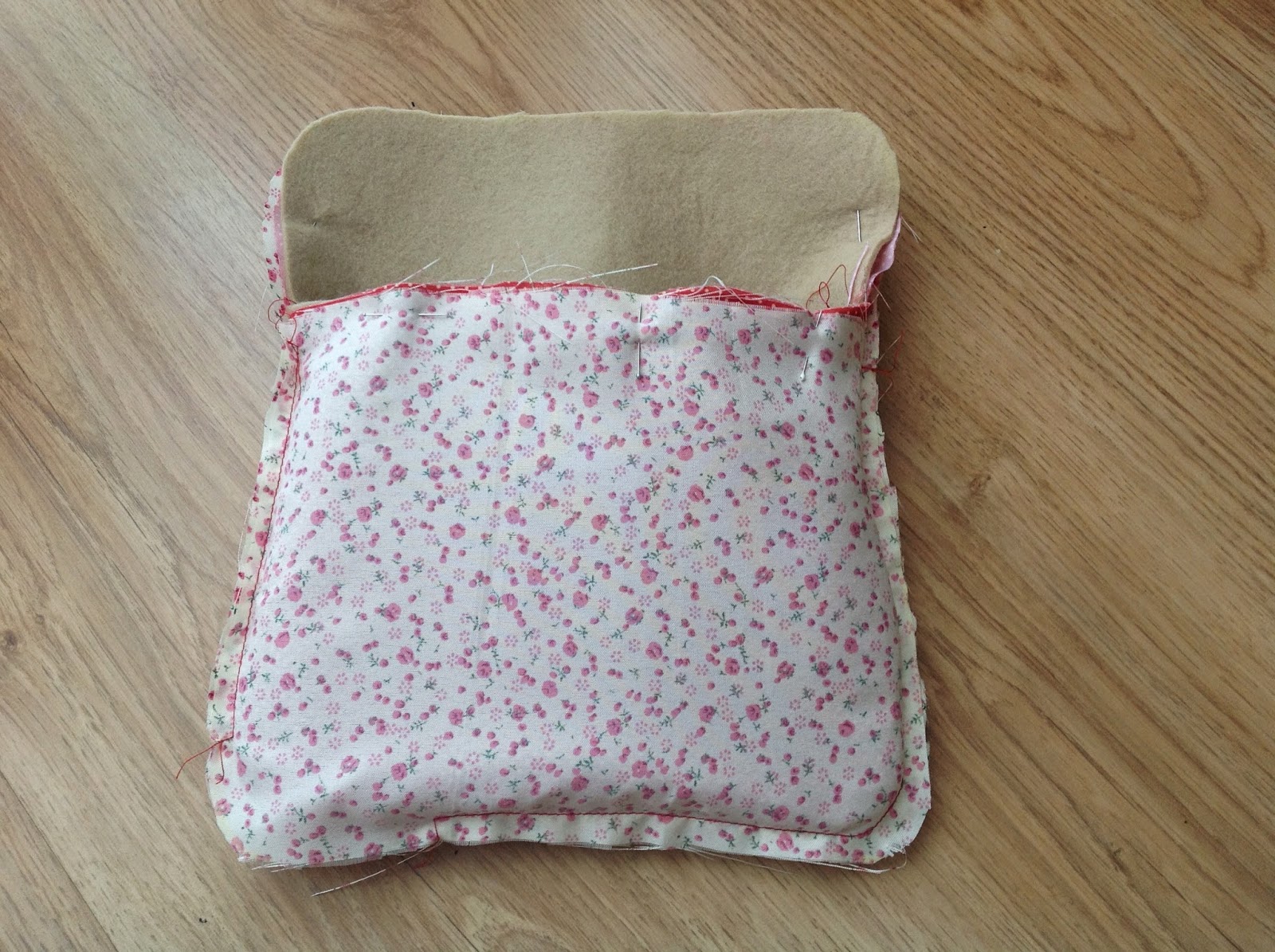 Pin around the edge of the bag making sure the the lining falls strait on the inside. Pin the flap as well, making sure it is centered.