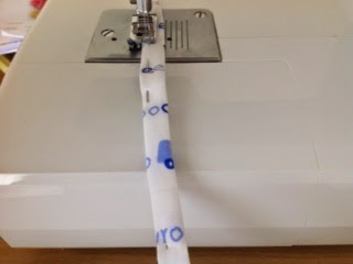 Before sewing the sides, however, because there was still some fabric leftover, I decided to make ties to close the opening. The ties are long strips of fabric folded bias tape style and then sewn on one side.